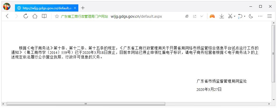 根據《電子商務法》第十條、第十二條、第十五條的規定,《廣東省工商行政管理局關于開展省局網絡市場監管綜合信息平臺試點運行工作的通知》(粵工商市字〔2014〕559號)已于2020年3月18日廢止,目前本網站已停止申領紅盾電子標識,請電子商務經營者根據《電子商務法》的上述規定依法履行公示營業執照、行政許可信息的義務。